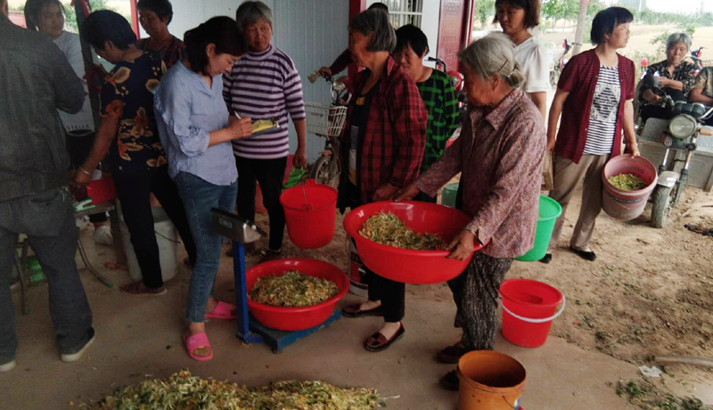 今年是金银花种植的第二年,由于水肥充足,长势良好,枝繁叶茂,郁郁葱茏,远远就闻到一股清香,遍地的金银花迎风绽放,百余名妇女在田间采摘新花,好一派繁忙的丰收景象。“金银花花期长,从5月中旬开始一直延续三个月。今年每亩能收干花50公斤以上,按190元/公斤计算,预计每亩收入近万元,今年金银花产值将突破120万元。随着根系越来越发达,三年内产量还会递增。”肖来山满脸自豪地介绍,“一个产业能带富一方人。现在周边村庄的中老年妇女等闲散劳动力都争抢着到这里打工。她们天一亮就赶到这里,干到10点天热了就下班,下午3点半点开始干,每天轻轻松松可以挣到50块钱以上,手头麻利的能采近20斤,收入可达到80元左右。”
