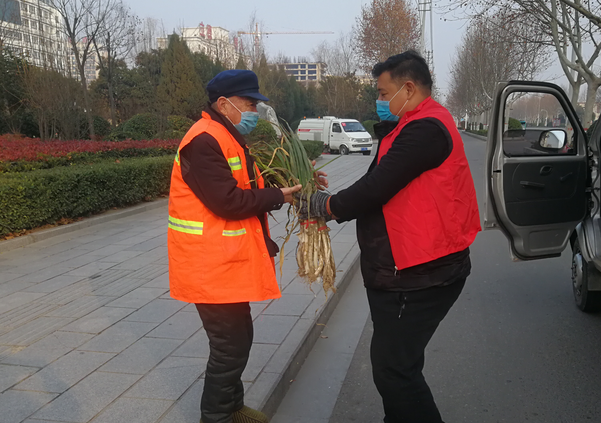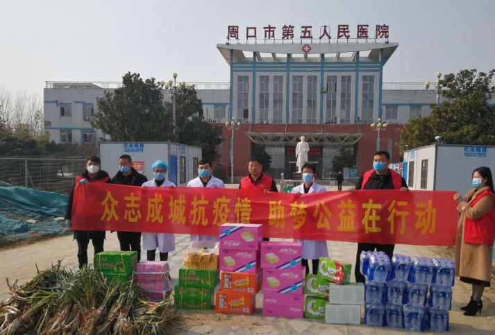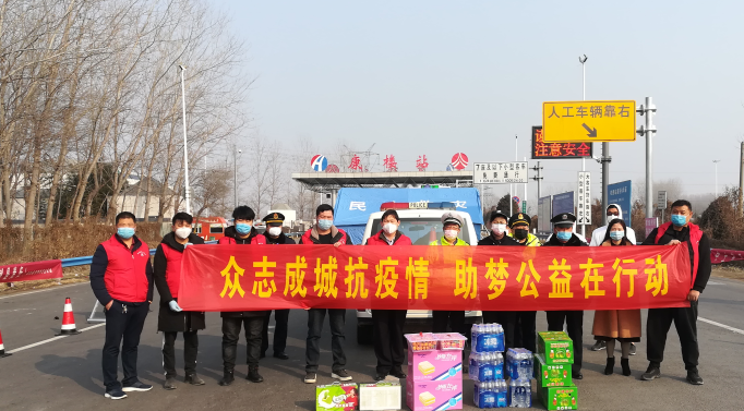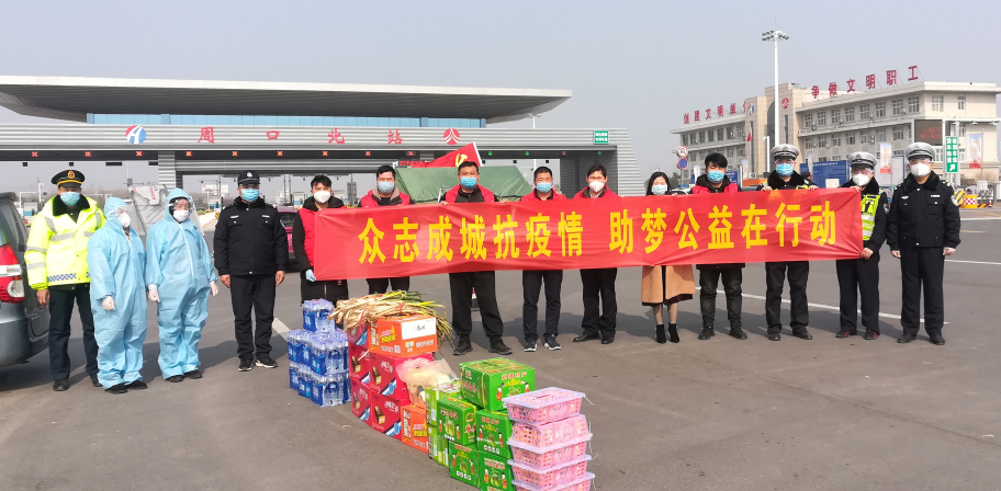2020年2月3日10:00许,十余名周口助梦公益团的志愿者在周口市文明办志愿服务科任宏阳科长的带领下分乘5辆车带着提前采购的湿巾、牛奶、面包、泡面、香梨、小香桔、矿泉水等爱心物资分别来到了大广高速周口东疫情防控卡点、商南高速周口北、周口市第五人民医院以及,安罗高速周口西站、商南高速康楼站、西华县李大庄乡卡点、宁洛高速周口南站卡点,最后志愿者们又来到了周口高铁东站慰问在那里执勤的民警,其间又为周口部分环卫工人、小区防控人员和周口福利院送去了志愿者捐赠的爱心大葱。