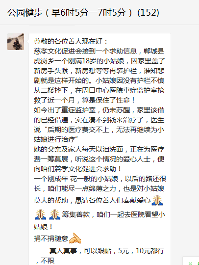 周口慈孝文化促进会,周口公园健步群,郸城老乡群。。。。。。都在转发这条信息。瞬间让周口这个大爱的城市的市民动了起来,爱心捐款很快就超过了万元。